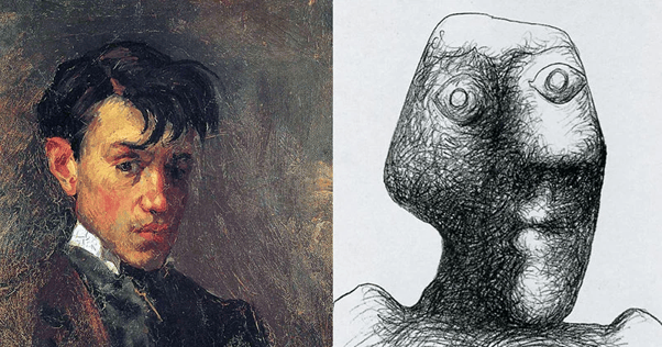On the left is Picasso’s first ever self-portrait (1896). On the right is his last (1972).