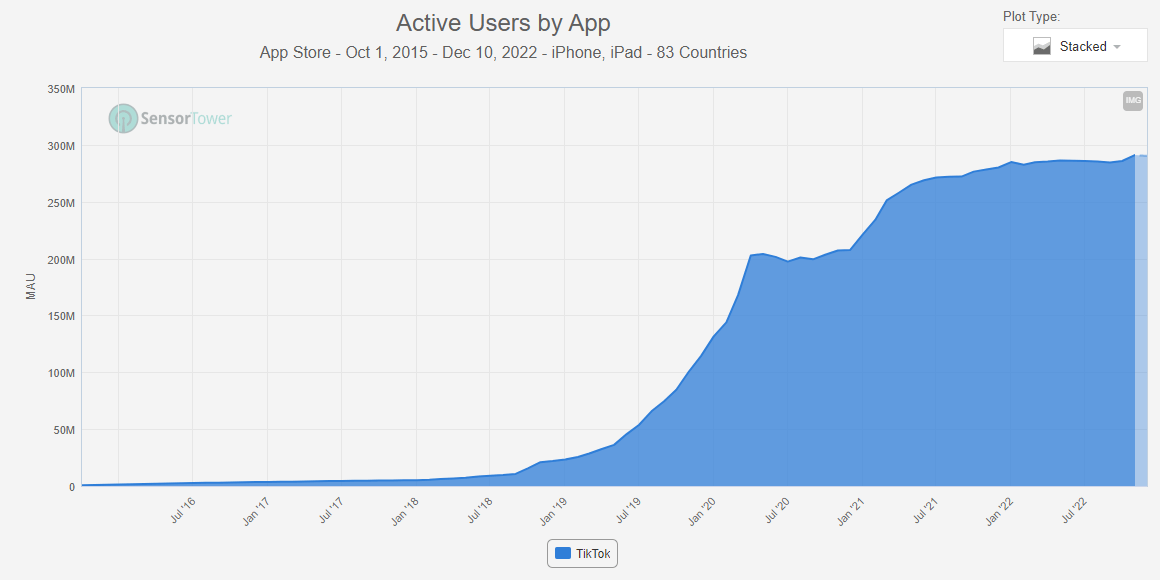 TikTok MAUs since launch (iOS + Android, incl. Musical.ly, excl. Douyin – Source: SensorTower)